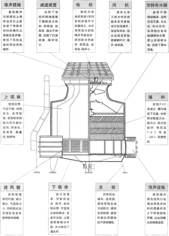 说明 1、噪声为标准点Dm测定值,即距屏蔽冷却塔远,距基础1.5米高。 2、本系列标准设计工况为湿球温度τ=28℃,进水温度t1=37℃,出水温度t2=32℃,即水温降Δt=5℃,逼近度t2-τ=4℃。 3、本表中列出τ=28℃时,Δt=5℃及8℃,t2=32℃和τ=27℃时,Δt=5℃及8℃,t2=32℃的冷却水量供选用时参考,其它参数的冷却水量请查热力性能曲线。 4、进水压力指接管点处水压1kgf/cm2=9.8×104Pa因而本系列水压在0.2~0.49kgf/cm2之间。