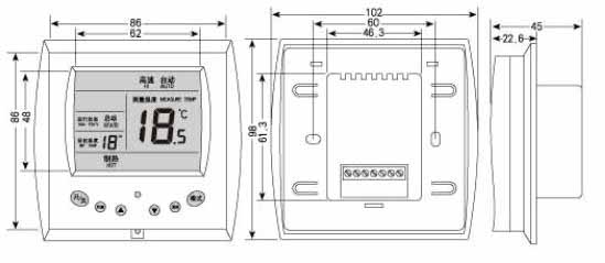 一、产品简介 8018系列温控器适用于工业、商业及家庭居室的温度控制,控制风机盘管(可配电动阀也可不配电动阀)或电动风阀。通过按键选择制热、制冷或通风等功能。二、功能及特点●超大屏幕全中文显示,用户操作界面更加友好。●外挂式安装结构,无需拆壳安装●全中文显示,界面友好 ●管理员界面功能: 按键锁定 温度校准 温限设置 过热保护温度设定三、技术指标 型号 工作电压 温控范围 额定电流 温控容差 接线方式 8018 220VAC±10% 5℃-85℃ 3A ±1℃ 端子