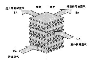 XHB系列热回收新风换气机 风量:300-5000m3/h 风压:40-250Pa 特点:吊顶式安装,通风和换气时,能最大限度不带走热量、效率可达70%以上,内置防尘过滤器,有效防止灰尘及杂物进入室内,节约能源、噪声低、运行可靠、维护简单 应用:敞开式办公区、大厅、计算机房、教室、工厂、商场、体育场、程控交换机房等。 一、工作原理 当室内空调回风和新风分别呈正交叉方式流经换热芯体,由于平隔板两侧气流存在着温度差和水蒸汽压差,两股气流间同时呈现传热传质现象,引起全热交换过程。这种过程是通过平隔板完成的,所以属透过型全热交换现象。当安装在系统上的全热交换新风机在夏季运行时,新风从空调回风中获得冷能使温度降低,同时被空调回风干燥,使新风含湿量降低;在冬季运行时新风从空调回风获得热能使温度升高,同时被空调回风干燥,使新风含湿量降低;在冬季运行时新风从空调回风获得热能使温度升高,同时被回风加湿,使新风含湿量增加,就这样通过换热芯体的全热交换过程新风从空调回风中回收能量。